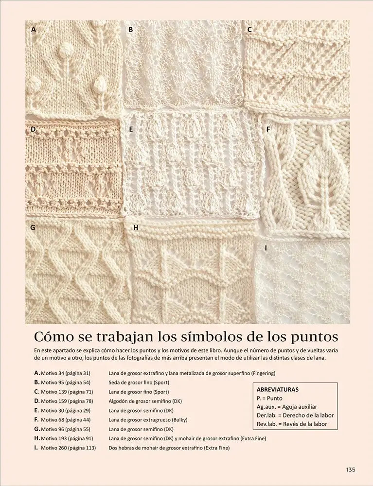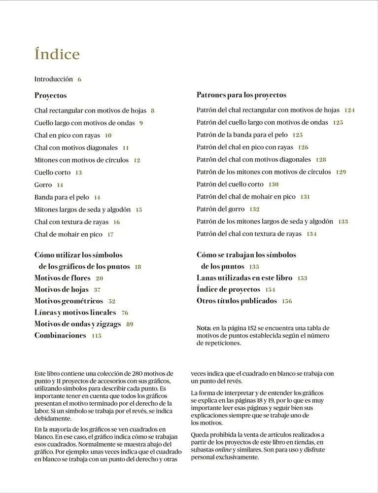 La obra ofrece una guía clara sobre el uso de símbolos gráficos, explicando con precisión cómo se leen e interpretan en el contexto del tejido. Se detalla la construcción de los puntos y se indican los sentidos de lectura, acompañando los gráficos con notas para asegurar la comprensión, tanto si se trabaja en derecho como en revés. Esta claridad técnica convierte al libro en una referencia sólida para tejedoras intermedias y avanzadas que quieran afianzar su lectura de esquemas.