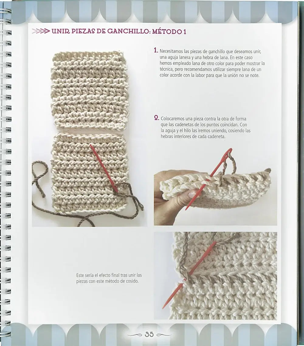 Cuando llegas al montaje, el libro cubre lo que más suele atascar: coser y unir piezas sin que el bolso pierda forma. En sus páginas aparece el bloque de técnicas de unión y acabados, donde explica cómo enfrentar las piezas, por qué hebras pasar la aguja lanera y cómo rematar para que la costura quede discreta. Son detalles que hacen el bolso más resistente y con mejor aspecto.