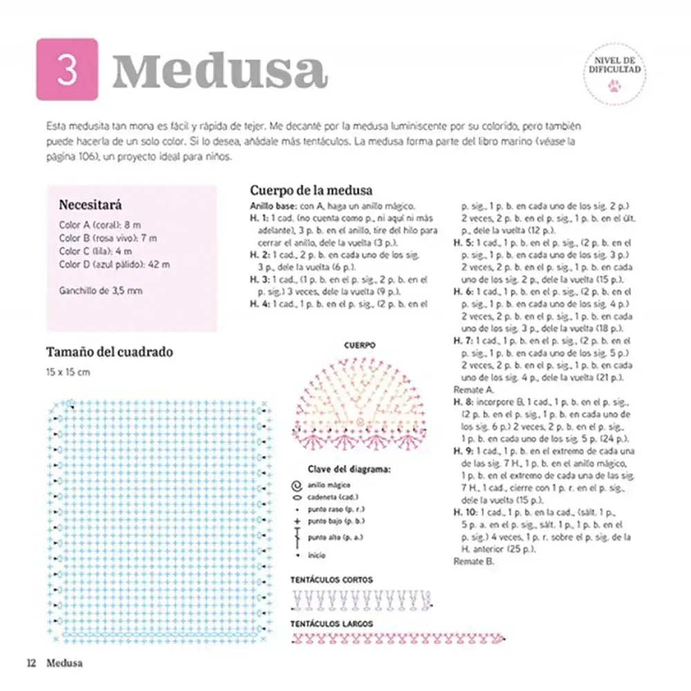 Los proyectos que incluye Cuadrados de ganchillo con animales representan un amplio abanico de criaturas: desde ranas, ardillas o chimpancés hasta medusas, mariquitas o unicornios. Cada cuadrado es de 15 x 15 cm, ideal para combinar en mantas, cojines o tapices decorativos. El enfoque visual es clave en cada diseño: se trabajan detalles como ojos, patas, tentáculos o colas para dar vida a los animales de forma sencilla pero llamativa. Las formas se adaptan bien a diferentes hilos y colores, lo que fomenta la personalización.