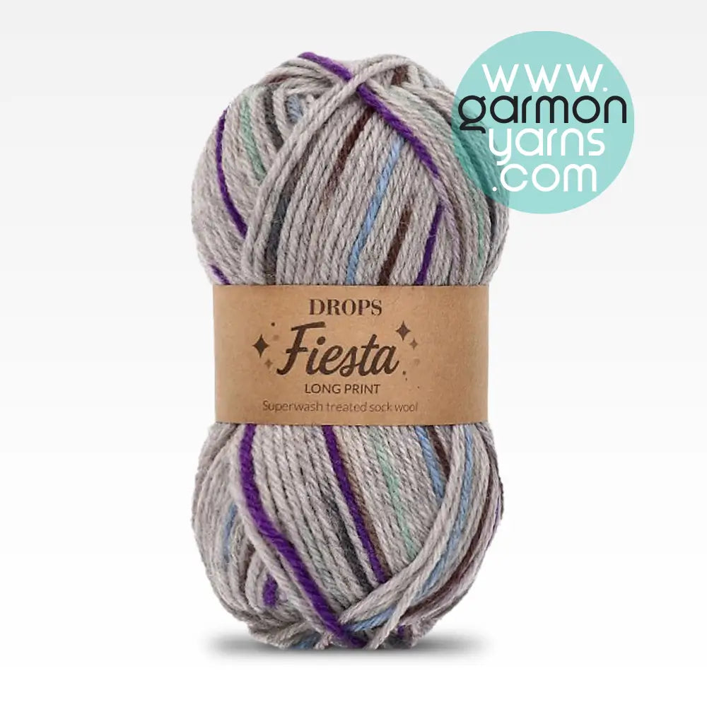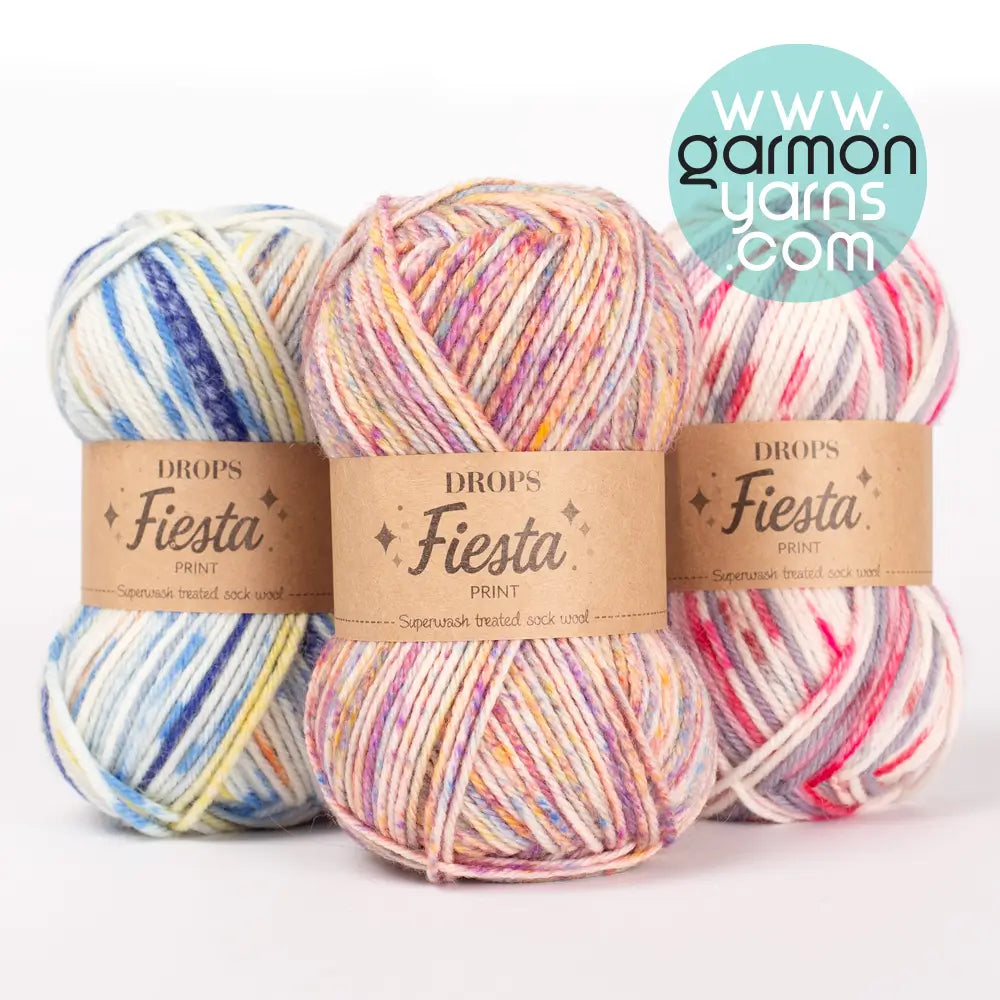 DROPS Fiesta es una lana para calcetines superwash de grosor DK, perteneciente al grupo de lanas B, con una mezcla de 75% lana y 25% poliamida en ovillos de 50 g (aprox. 110 m). La construcción de cuatro hebras y la combinación de fibras aportan calidez, ligereza y buena resistencia al roce, de modo que calcetines y prendas de uso diario soportan mejor el desgaste. Es un hilo DK para calcetines agradable al tacto, con elasticidad equilibrada y buena definición de punto, tanto para tejer a dos agujas como a ganchillo.