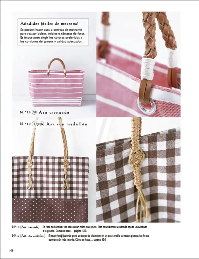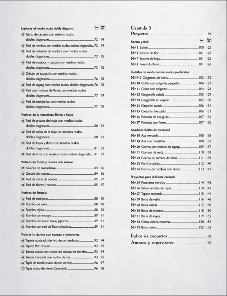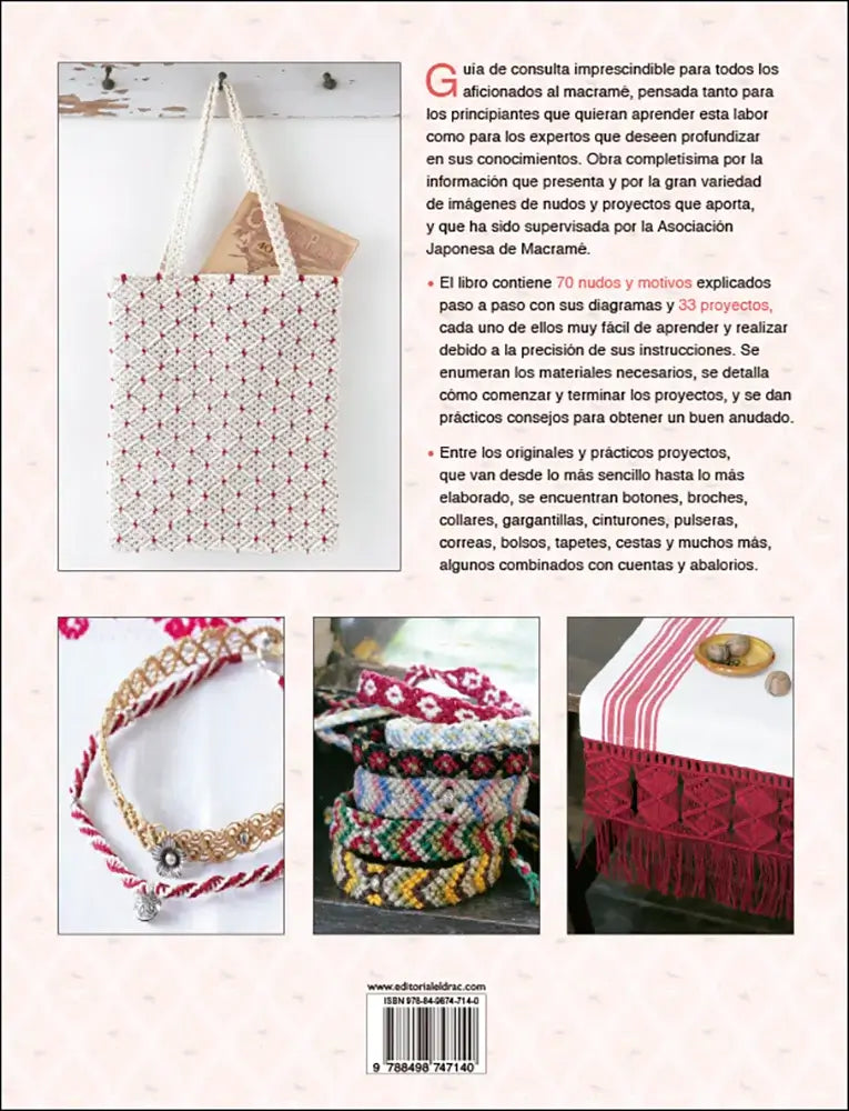 La parte de proyectos está pensada para poner todo en práctica con resultados muy visibles. Propone piezas sencillas y otras más elaboradas: botones, broches, collares, gargantillas, cinturones, pulseras, asas y correas, además de proyectos más grandes como bolsos, tapetes o cestas. En la contraportada se indica que hay 33 proyectos y que el contenido fue supervisado por la Asociación Japonesa de Macramé, un detalle también relevante si buscas guía fiable.
