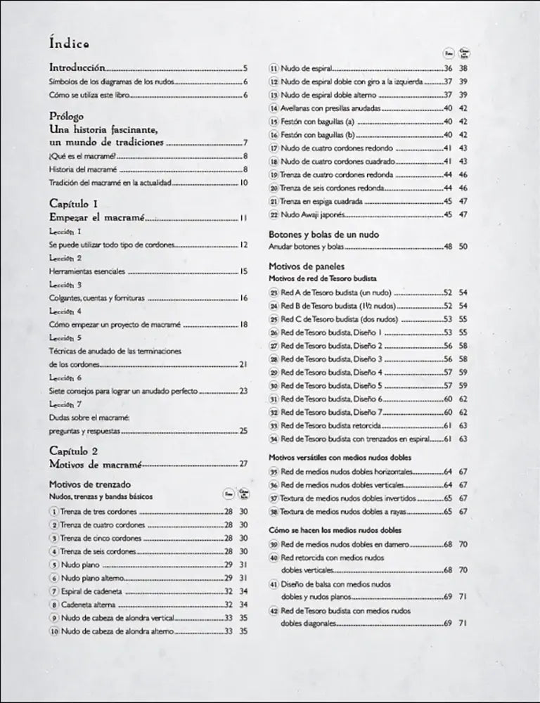 En El gran libro del macramé los símbolos de los diagramas tienen un papel clave: incluyen una guía visual para reconocer cada tipo de nudo y enlazarlo con la explicación paso a paso. Así puedes consultar un motivo concreto, ver cómo se repite y entender cómo se construye el patrón sin improvisar. Si buscas diagramas o nudos y proyectos, este enfoque es precisamente lo que lo hace tan usable.