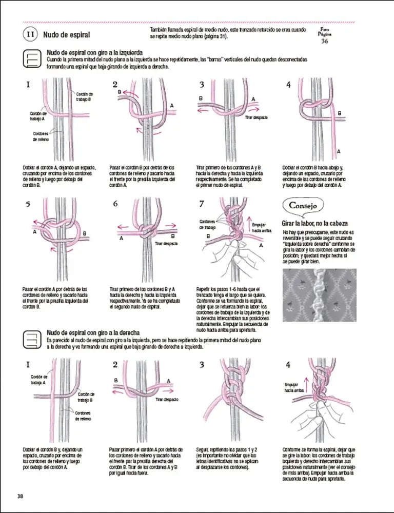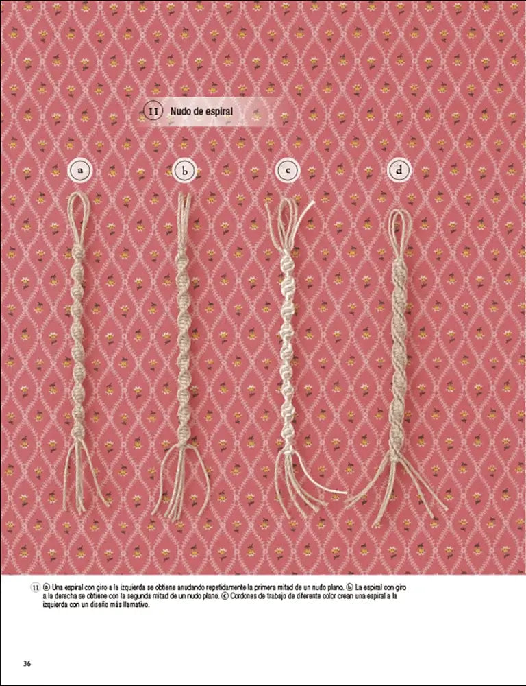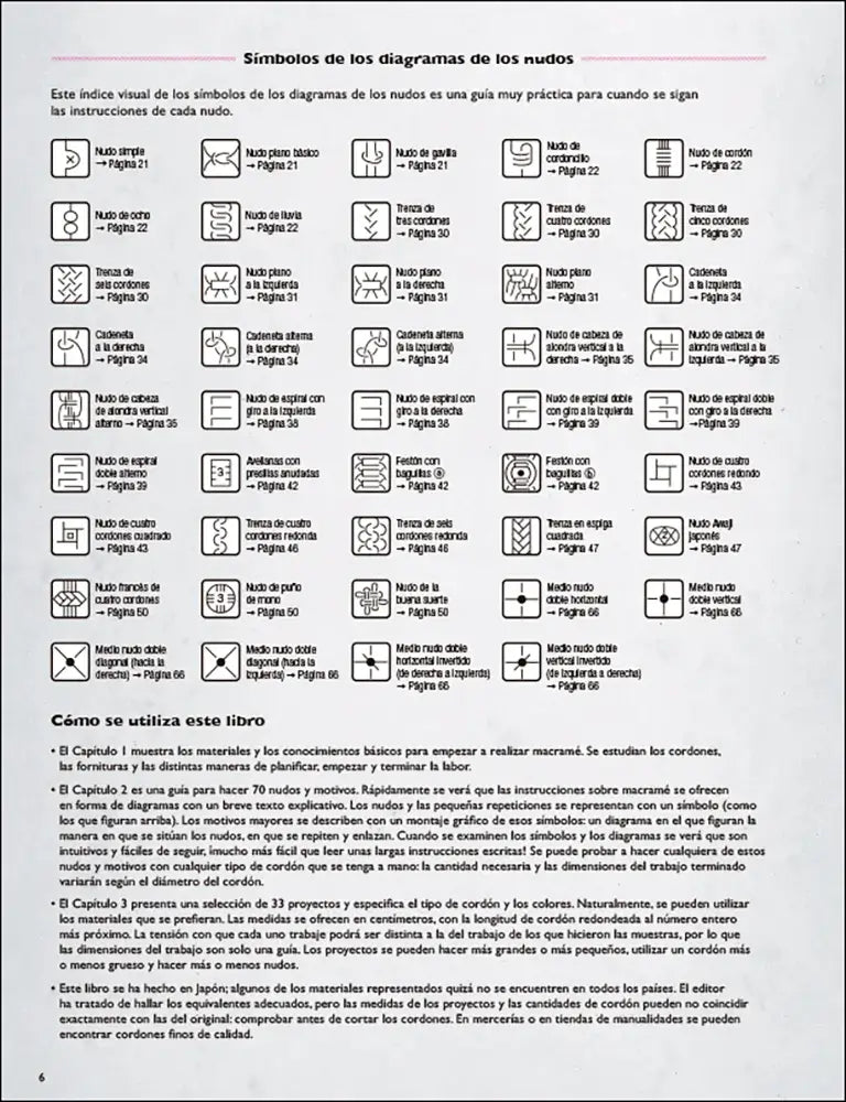 A partir de ahí, el contenido se apoya en un sistema visual: diagramas, símbolos y secuencias que facilitan entender cada movimiento del cordón sin depender de textos largos. Esa forma de enseñar hace que puedas volver a un nudo concreto cuando lo necesites y retomar el trabajo sin dudas, incluso si llevas tiempo sin practicar o quieres repasar antes de empezar un proyecto, con la pieza delante en tu mesa.