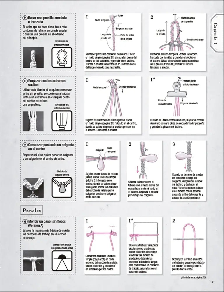 Además de los diagramas, incorpora recursos que te ayudan a tomar decisiones antes de anudar: cómo empezar una tira o un panel, cuándo añadir un colgante o flecos, y qué método de montaje te conviene según el resultado que quieras. Esa parte práctica reduce errores típicos de principiante y te da un “mapa” de trabajo para avanzar con orden, incluso cuando cambias de idea a mitad del proyecto, muy claramente.