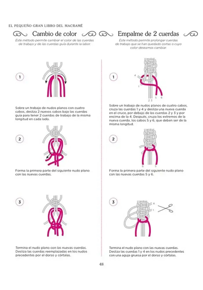 En las páginas dedicadas a nudos se nota el enfoque pedagógico: cada movimiento está separado en pasos numerados y con flechas, para que entiendas qué cuerda trabaja y cuál hace de guía. Verás ejemplos como el nudo plano y variaciones que se construyen a partir de él, además de combinaciones para formar filas y motivos. Si te interesa dominar nudos básicos de macramé, El pequeño gran libro del macramé, es el libro adecuado; en él practicas de forma ordenada.
