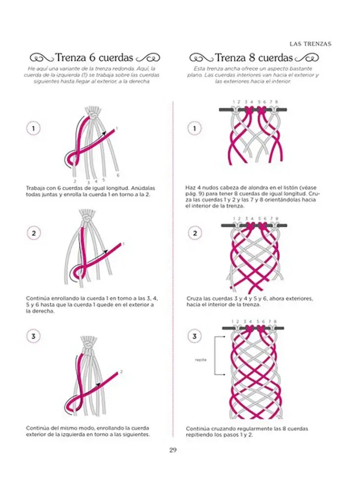 El libro no se queda en el nudo suelto: muestra cómo trasladar esa técnica a estructuras que “dibujan” líneas, diagonales y relieves, para que tus piezas ganen personalidad. En el se incluyen ejemplos de cordones simples y dobles, y de trenzas, explicados con el mismo sistema visual. Esa parte es clave si quieres practicar trenzas y cordones de macramé sin depender de vídeos ni pausas constantes.