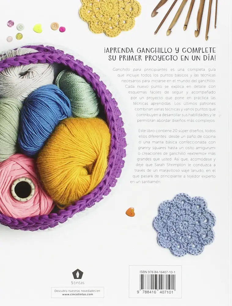 Si quieres empezar desde cero, el libro Ganchillo para principiantes: 20 proyectos para aprender a tejer de Sarah Shrimpton plantea un camino muy directo: aprender lo esencial y terminar algo real cuanto antes. La propia contraportada promete que puedes completar tu primer proyecto en un día, y el enfoque va justo a eso: avances rápidos, sin teoría innecesaria. Ideal si estás valorando comprar un libro de ganchillo para principiantes para ganar confianza.
