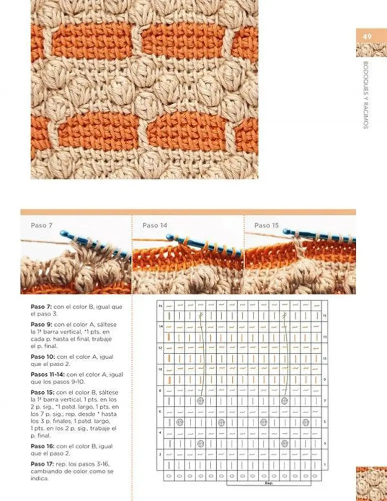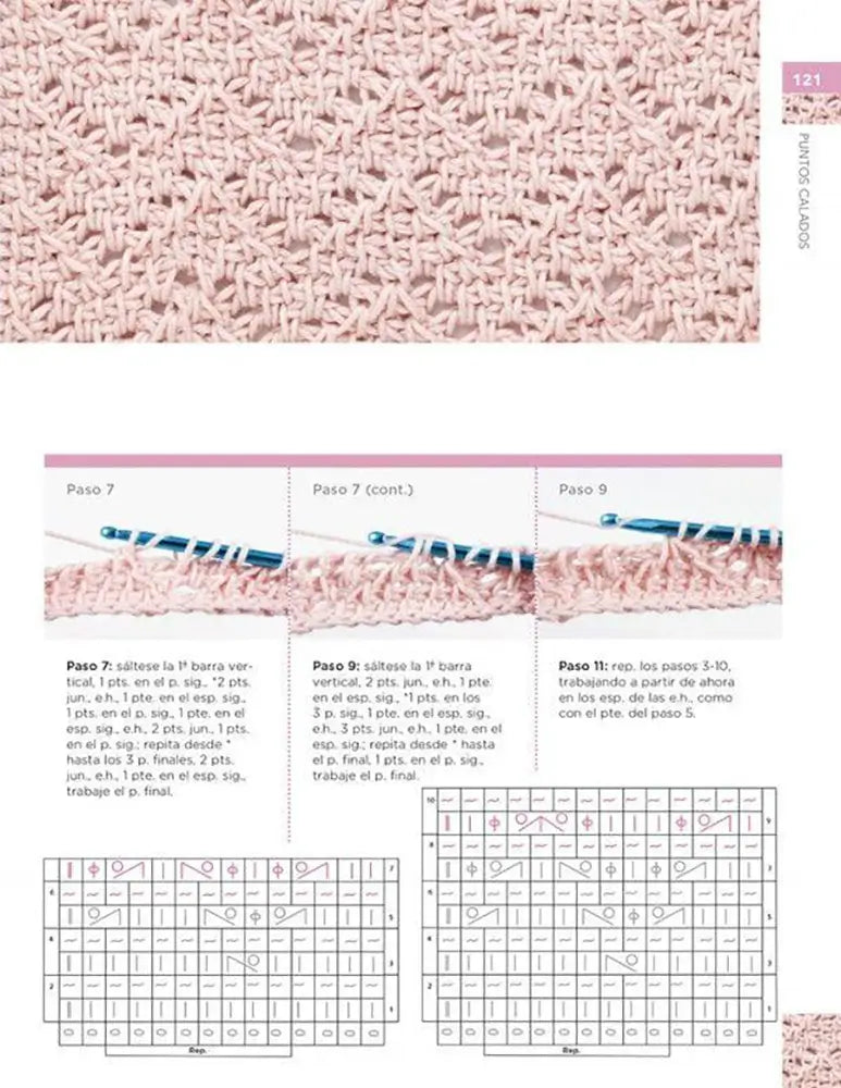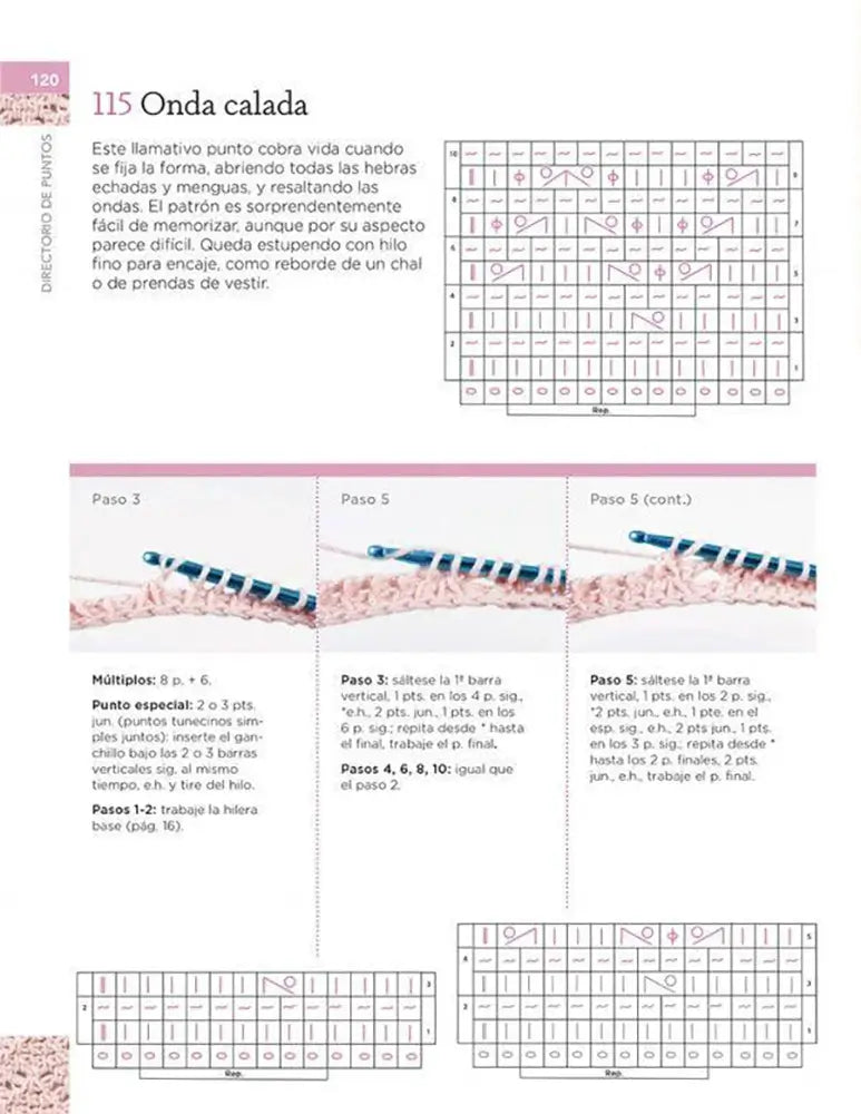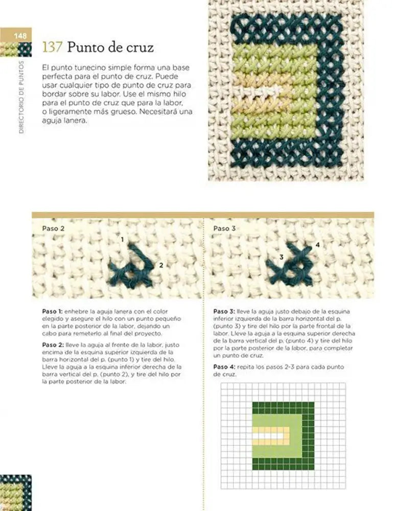 A nivel didáctico, el libro está planteado para que no dependas solo del texto. Cada punto se apoya en fotografías por pasos y un diagrama, y suele indicar datos útiles como los múltiplos o el punto especial, algo clave en tunecino para que el motivo “cuadre”. El Manual de Puntos de Ganchillo Tunecino organizado por temáticas hace que avanzar sea más ordenado: empiezas por bases, entiendes la lógica y luego exploras variaciones más vistosas.