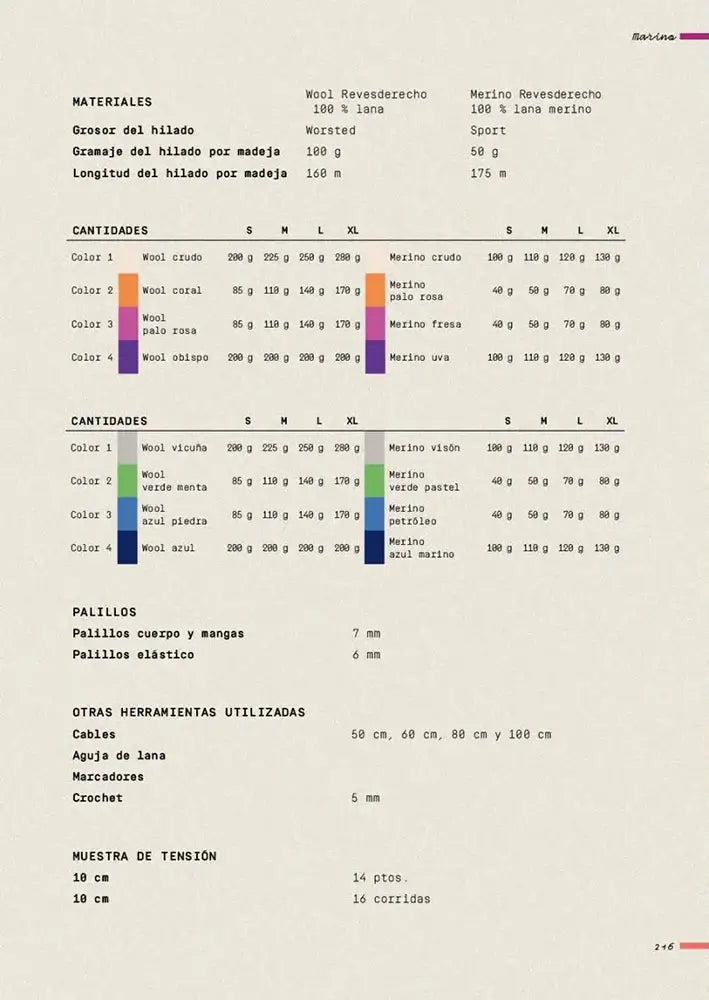 La propuesta de Jandi Gardiazabal destaca por su paleta cromática cuidada y envolvente. Cada prenda utiliza combinaciones de tonos cálidos, fríos y neutros que evocan la luz submarina, los atardeceres junto al mar o la profundidad del agua. El objetivo no es solo reproducir estos diseños, sino ofrecer un punto de partida para que cada persona los adapte a su visión. El libro Marino. Tejer Jacquard celebra la libertad de experimentar con formas y colores al tejer.