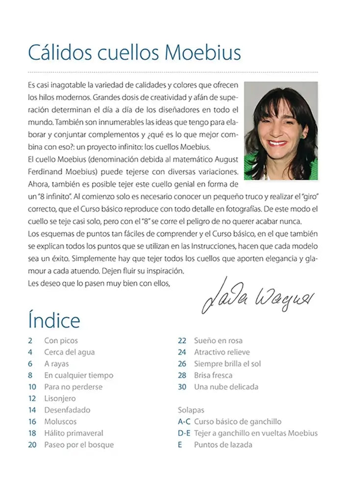 Una de las grandes virtudes del libro Cuellos Moebius de ganchillo es que no se limita a presentar los patrones sin más. El contenido comienza con un curso básico en el que se explica paso a paso cómo realizar el giro Moebius correctamente, incluyendo fotografías ilustrativas que eliminan cualquier duda. Esta introducción técnica permite al lector abordar los proyectos con seguridad y entender por qué este tipo de cuello tiene una estructura tan característica. El resultado es un recorrido creativo que combina claridad, técnica y diseño.