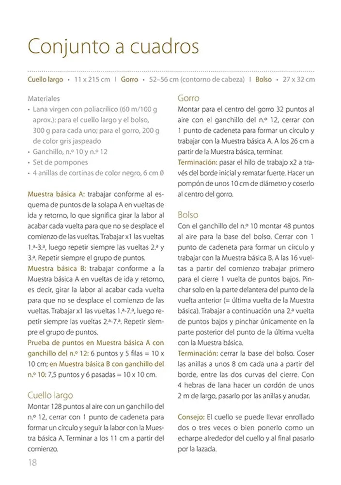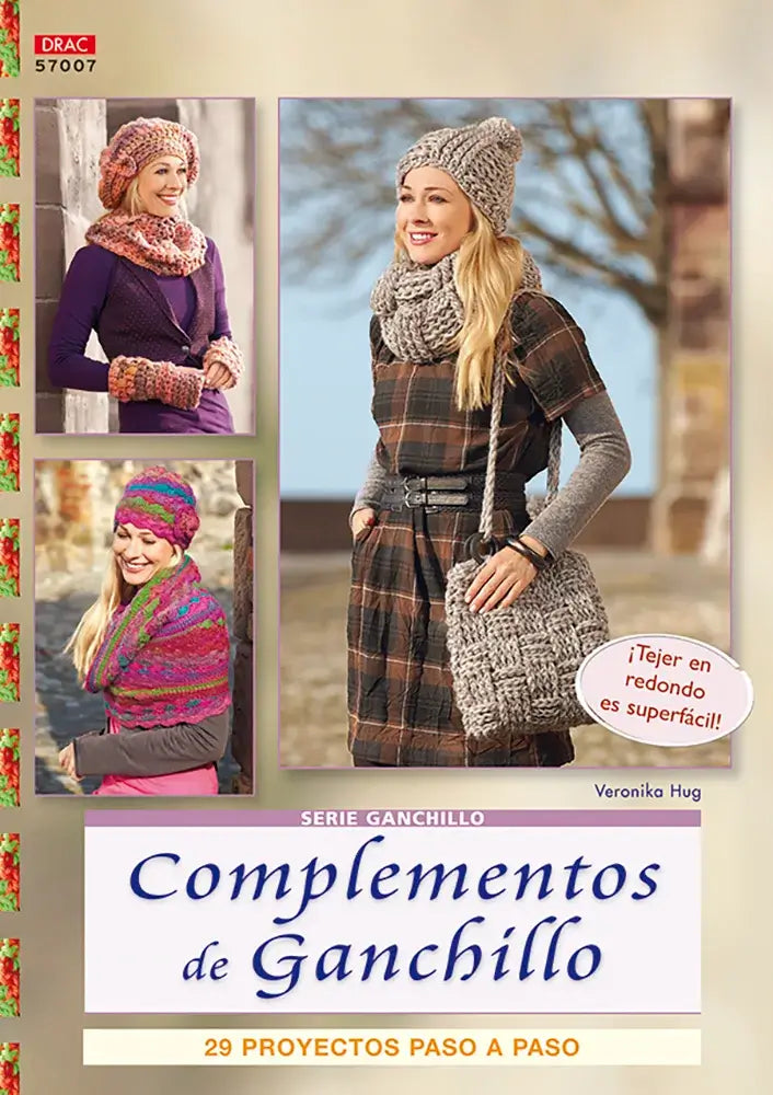 El enfoque se basa en el tejido en redondo, una técnica que permite trabajar sin unir piezas, haciendo que todo encaje perfectamente desde el primer momento. Los diseños incluidos abarcan desde gorros, cuellos y bufandas hasta bolsos, calentadores y combinaciones completas para invierno. Todos los modelos están pensados para ser tejidos con ganchillos grandes y lanas gruesas, lo que permite avanzar con rapidez y obtener piezas abrigadas, voluminosas y con gran presencia visual.