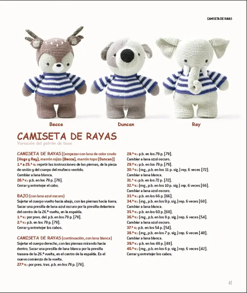 En sus páginas encontrarás patrones para vestir a cuatro personajes base de amigurumi: el oso Hugo, la cierva Becca, el perro Duncan y el elefante Ray. A partir de ellos, el libro despliega una variedad de atuendos que combinan color, fantasía y funcionalidad. Hay conjuntos para todas las estaciones, trajes temáticos como marinero, hada, bruja o vaquero, y muchas otras ideas creativas que podrás adaptar a tu gusto. La estética es limpia, moderna y muy cuidada en todos sus detalles.