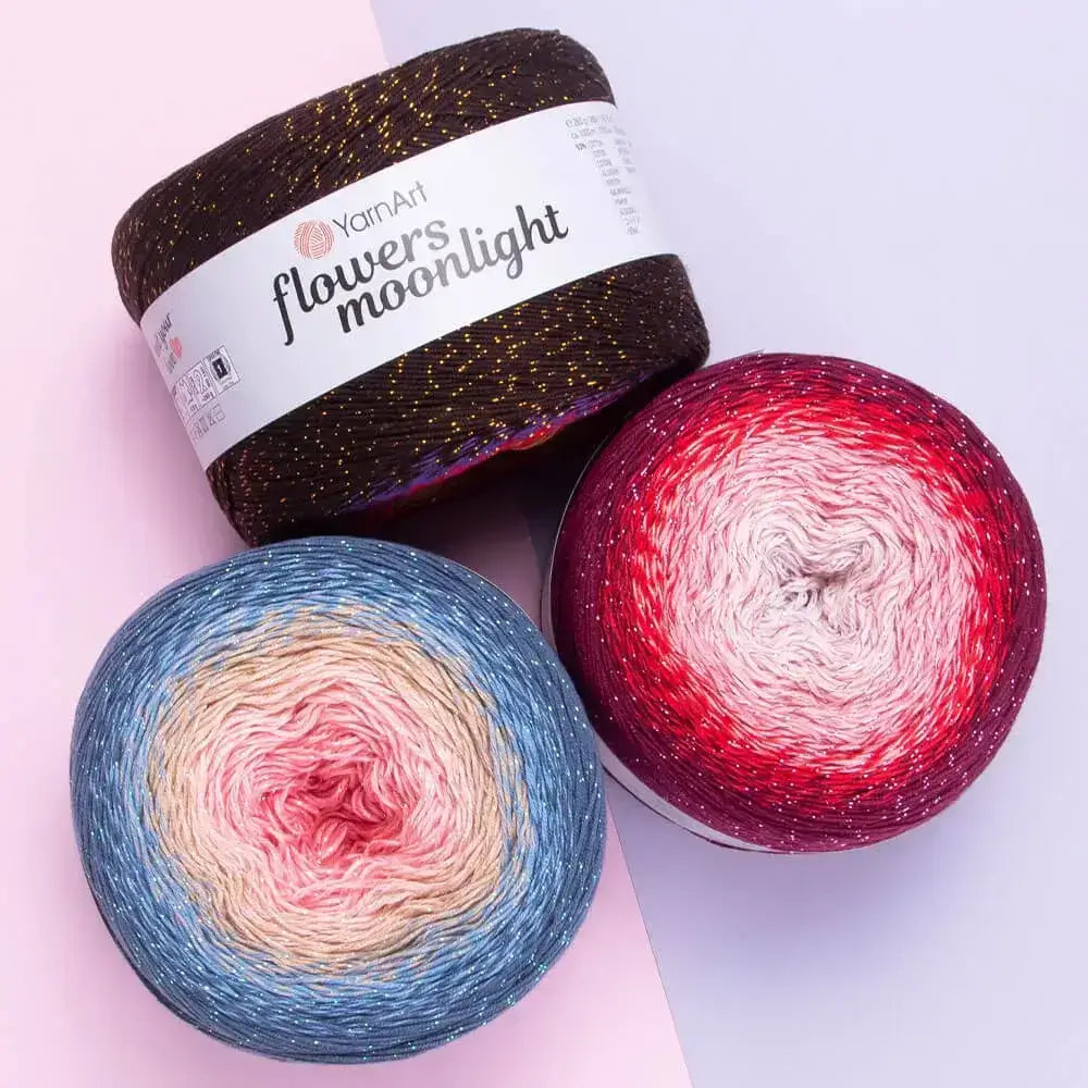 YarnArt Flowers Moonlight es un hilo elegante y llamativo, diseñado para dar un toque de brillo sutil a tus proyectos de primavera o verano. Esta versión brillante de la conocida serie Flowers de la marca Turca YarnArt incorpora delicadas fibras metálicas (lurex) que se entrelazan con sus característicos degradados, creando un efecto visual sofisticado y lleno de personalidad.