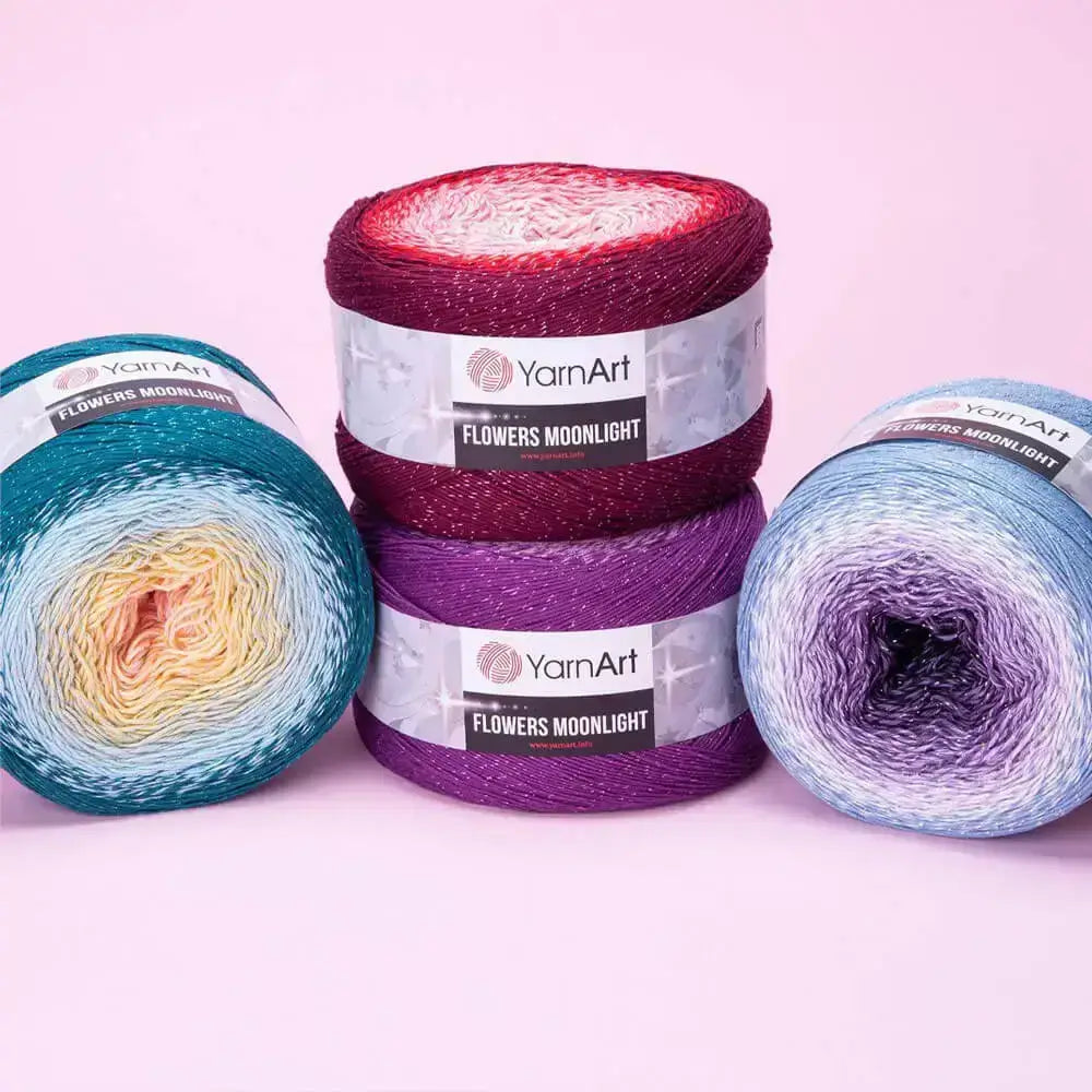 Flowers Moonlight es un hilo de tipo cake (bolo) diseñado para ofrecer gradientes de color continuos y un elegante toque brillante gracias al 4 % de hilo metálico lurex. Con su generoso formato de 260 g (1000 m), ofrece suficiente material para crear proyectos de tamaño mediano con un solo bolo, como chales, blusas, mantas ligeras o accesorios de verano.