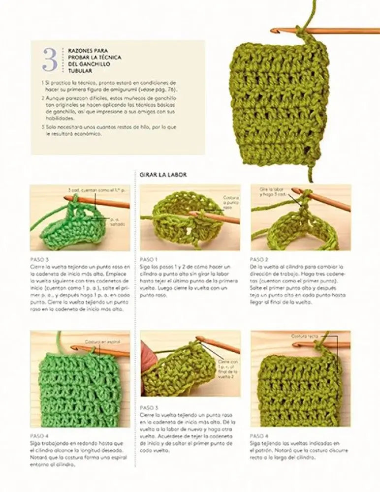 Ao longo do Manual de técnicas de croché encontras explicações visuais com fotografias e esquemas que facilitam seguir cada movimento, passo a passo. Trabalham-se pontos, texturas e rendados, e também recursos que muitas vezes custam, como o trabalho em redondo. Nas páginas interiores vê-se o exemplo de croché tubular, com passos claros e variantes para conseguires um tecido uniforme e limpo, ideal para peças circulares.