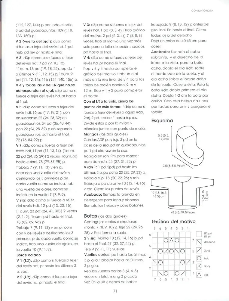 Em Tricot para bebés as receitas de tricot são apresentadas com as abreviaturas habituais do tricot e com carreiras detalhadas, para que possas seguir o esquema com ritmo. Além da explicação escrita, há recursos visuais que ajudam muito: esquemas das peças com medidas e gráficos de motivos com a respetiva legenda. Inclui também secções de acabamento, com indicações de costura e de remate das pontas, para que o resultado fique bem finalizado.